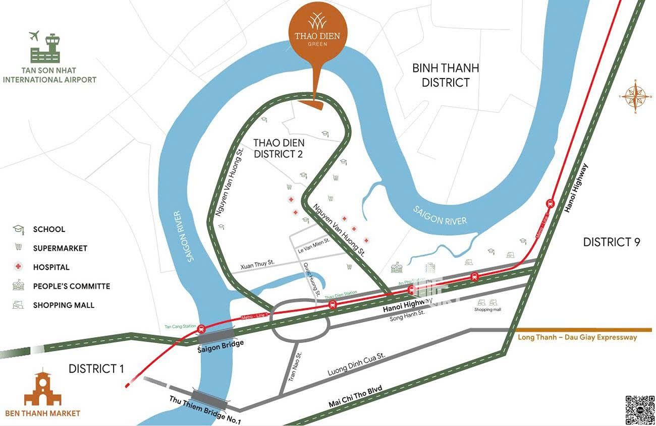 Thảo Điền Green tọa lạc tại mặt tiền đường Nguyễn Văn Hưởng, trung tâm Thảo Điền – Quận 2. Đây là một trong những khu vực phát triển sôi động nhất TP.HCM, nổi tiếng với cộng đồng cư dân đa quốc gia, môi trường sống văn minh và tiện ích hiện hữu.